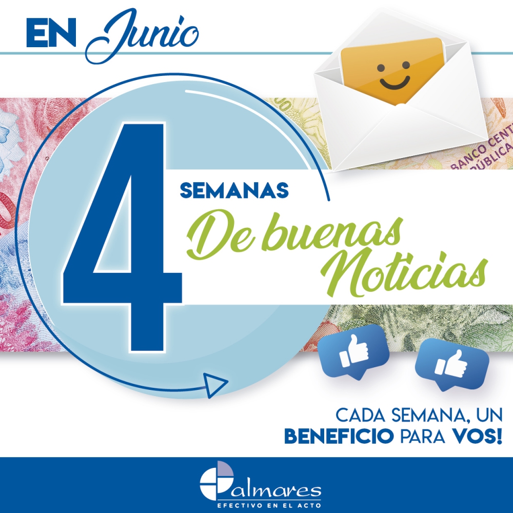 El mes de junio, luego de tres meses de pandemia, Palmares llevó adelante una promoción muy especial: "4 Semanas - 4 Buenas Noticias". Conscientes de la importancia que tenía para la comunidad contar con novedades positivas en medio del ambiente adverso, se propuso una acción en la cual durante 4 semanas ofrecimos beneficios especiales a nuestros clientes.
